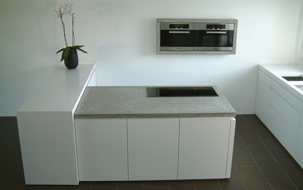 ist diese Küche bestehend aus weißen Feinsteinzeug-Arbeitsplatten,