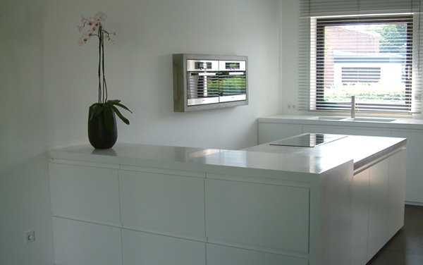 Auf der Sichtseite der Arbeitsfläche befinden sich in den weißen Unterschränken grifflose Schubfächer, die aus dem Essbereich bedienbar sind. Den sauberen Abschluss bildet die Arbeitsplatte aus weißem Feinsteinzeug.