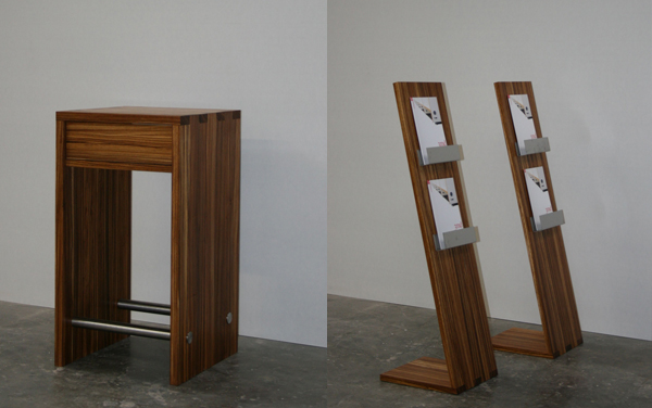dazu passenden Prospektständer aus massivem, geölten Zebrano entwickelt.
