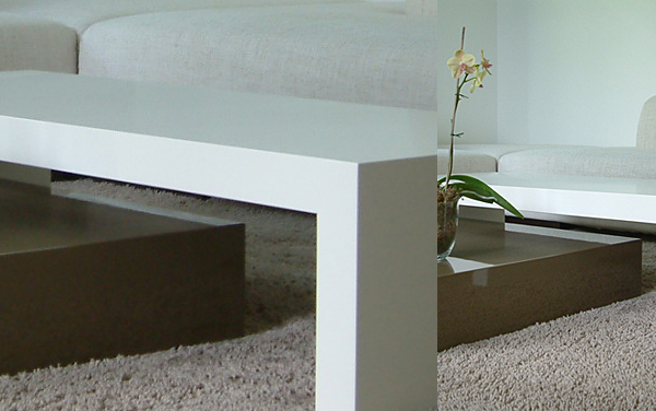 D ieser Couchtisch besteht aus zwei schlichten Einzelteilen; einer weiß lackierten Bank und einem hochglanzlackierten olivgrünen Kubus. Zusammen ergibt sich hieraus ein schöner Mittelpunkt des Wohnzimmers.